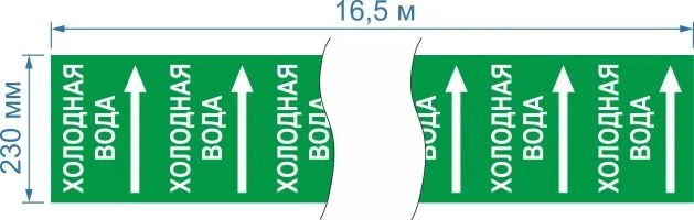 Опознавательная маркировочная лента зеленая с белой надписью Холодная вода и стрелкой 230мм x 16,5м