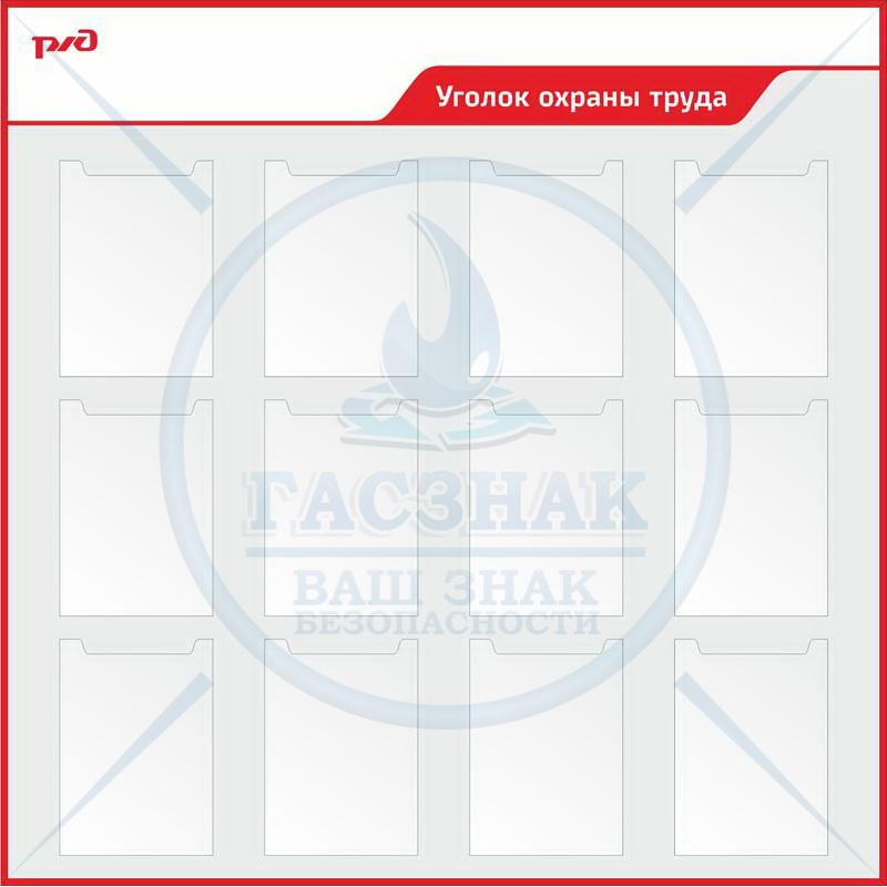 Стенд по охране труда для ОАО РЖД Охраны труда, металлокомпозит, 3 мм с профилем NIELSEN, с 6-ю карманами и перекидной системмой А4 на 10 рам.(1400х1200)