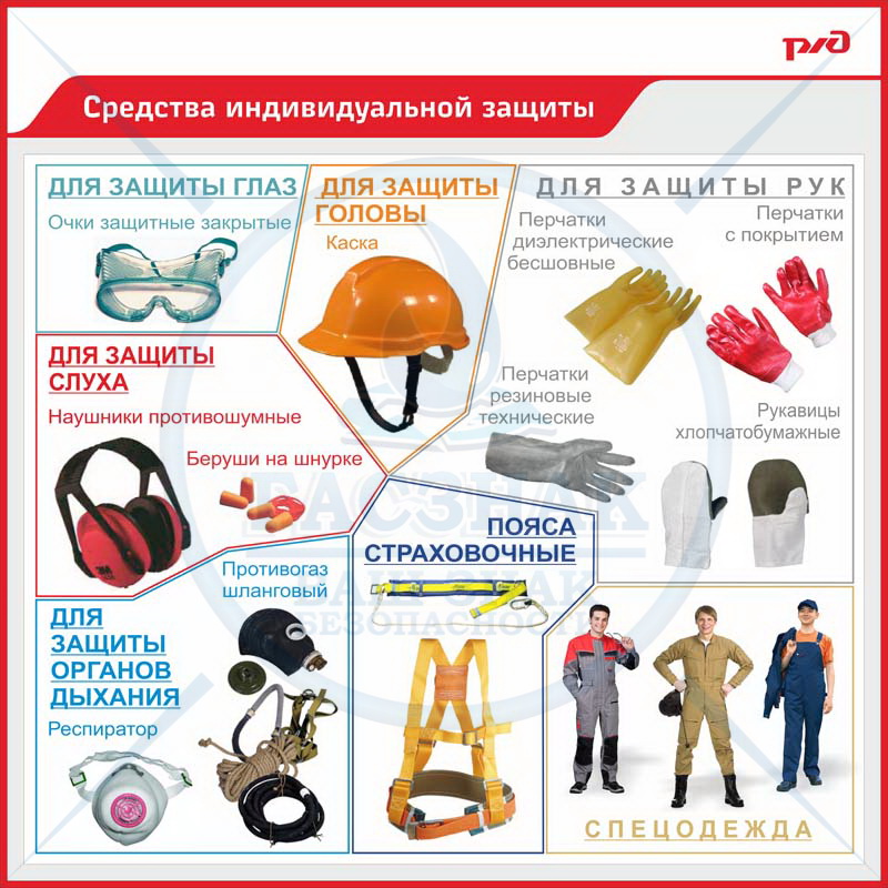 Стенды по охране труда для ОАО РЖД Средства индивидуальной защиты 3 плаката А2, 3 плоских кармана А4, 2 объемных кармана А4 (Пластик ПВХ 4 мм, алюминиевый профиль; 1400х1200)