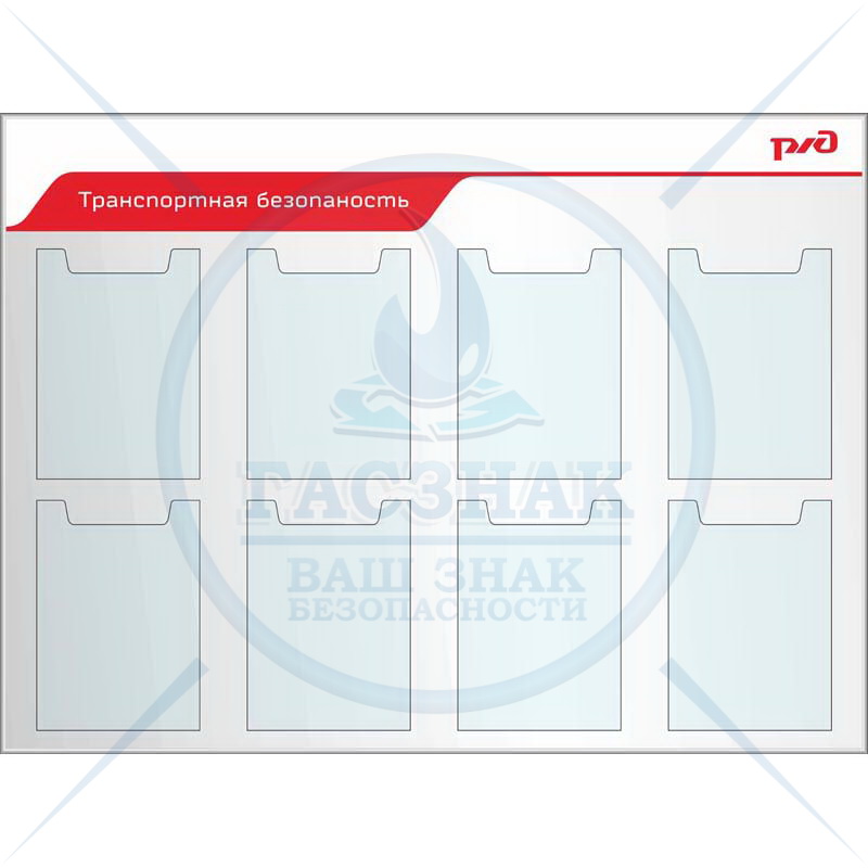 Стенд Уголок охраны труда РЖД, 6 объемных кармана А4, 1 карман гориз. А3 (1150х1100; Пластик ПВХ 4 мм, алюминиевый профиль; )