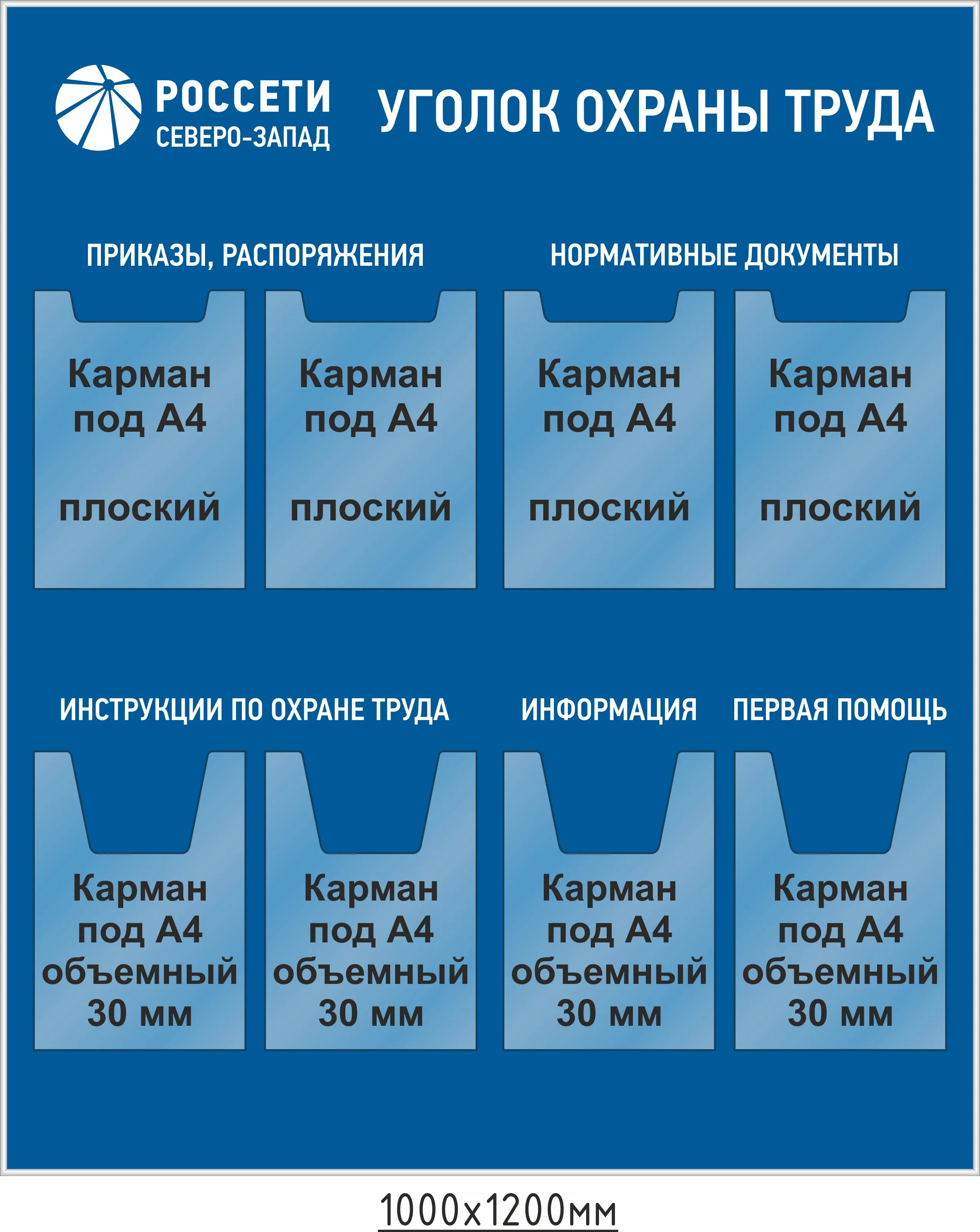 Стенд Охрана труда ПГК (Карман А4-2ШТ. объемный, формат А4-1шт. плоский, 1 перекидная система А4-10листов), Логотип (750х1000; Пластик ПВХ 4 мм, алюминиевый профиль; )
