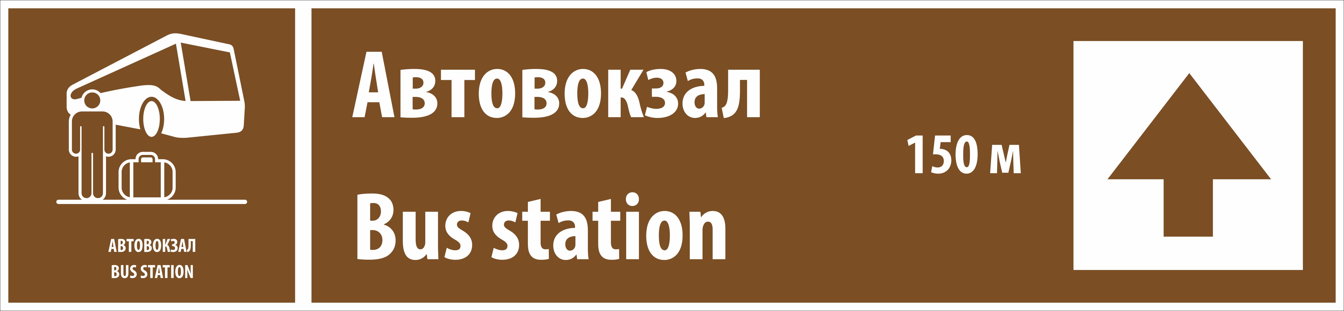Указатель направления "Автовокзал, 150 м" входит в группу знаков туристической навигации. Используется для указания направления к туристическому объекту, чтобы помочь туристам ориентироваться на незнакомой местности.