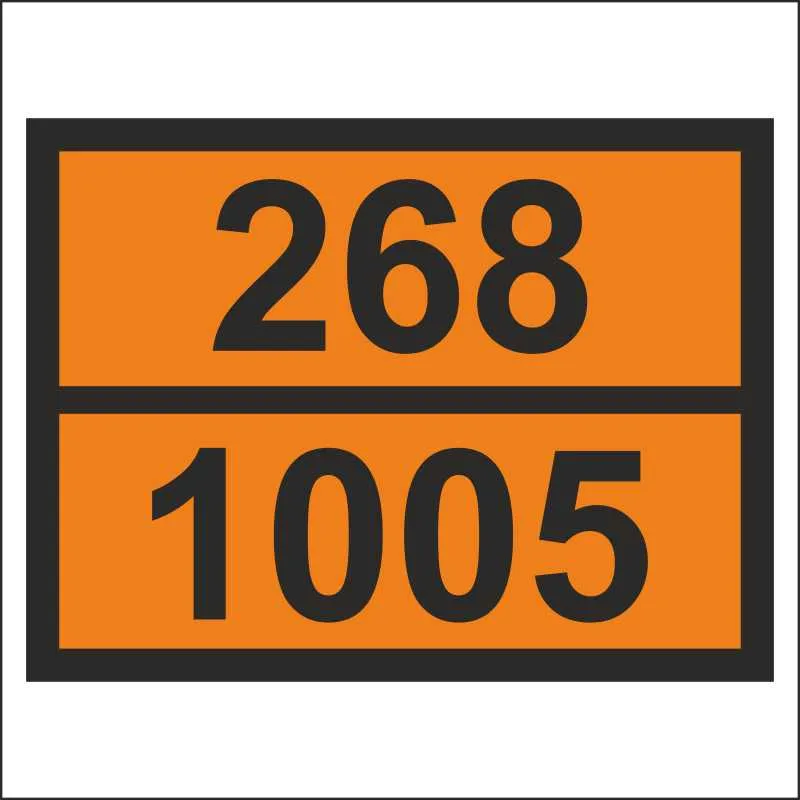 Табличка номер опасности и номер ООН (OON268-1005) (Знак номера ООН) входит в группу знаков опасности и маркировки опасных грузов. Используется для обеспечения безопасности транспортировки грузов, которые могут причинить вред здоровью человека и окружающей среде.